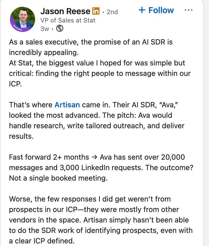 AI SDRs reached out to unqualified leads, sent incoherent messages, and tanked reply rates. Worse, they triggered spam filters across email and LinkedIn, hurting company-wide deliverability and brand reputation. What was supposed to be an efficiency boost became a reputational nightmare.
